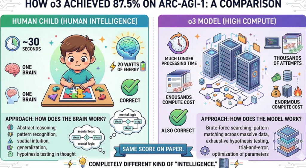 The earlier LLMs followed a path. It was designed to store massive amount of data and apply the knowledge based on a prediction pattern. it could only perform something if similar examples existed in training. But then in 2024, the o3 model which scored 87.5% on ARC- AGI — 1 test. The jump was a significant improvement from a year earlier. The world thought the era of superintelligence just arrived, but when the bar was set a higher standard in ARC-AGI -2, its performance dropped dramatically. The same model scored approximately 2.9% to 3.0% on the ARC-AGI-2 semi-private evaluation where human scored 60 percent. What changed.